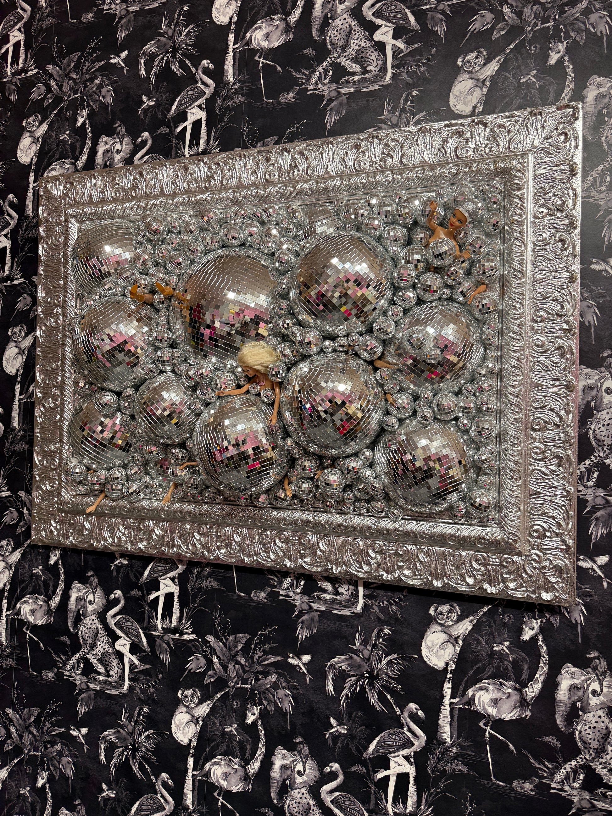 Part of my ongoing Toys R Art collection, Disco Dolls is created using reclaimed Barbies and materials rescued from my workshop, transforming forgotten objects into bold, nostalgic art. Dolls emerge through mirrored disco balls, capturing movement, joy and reinvention, playful on the surface with a deeper story of second chances and transformation.